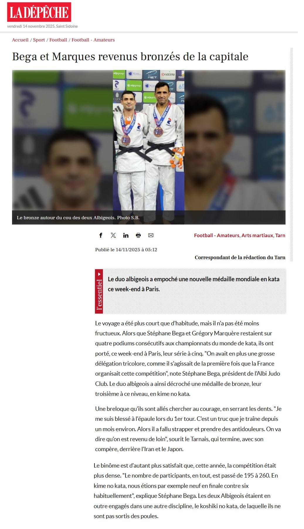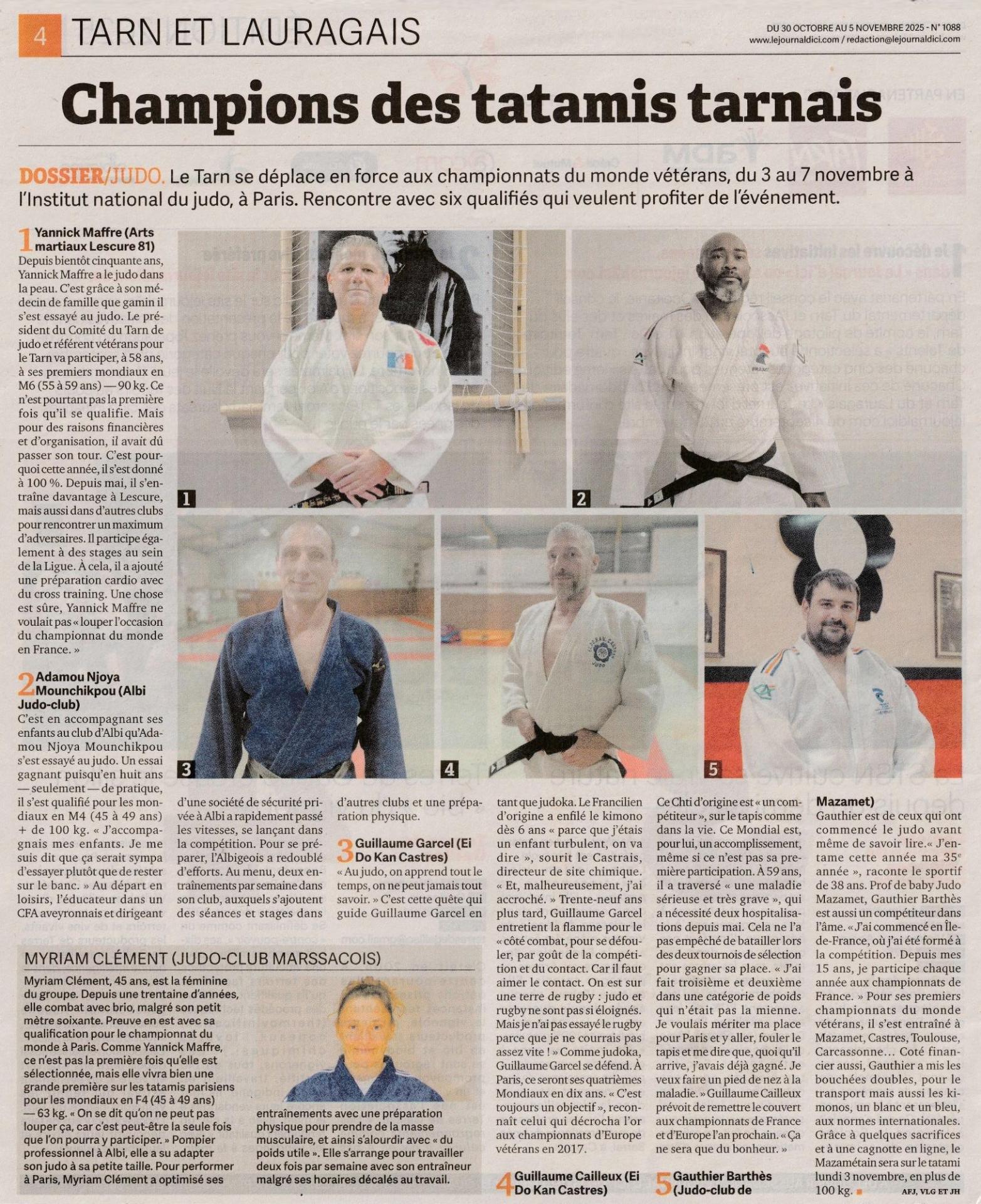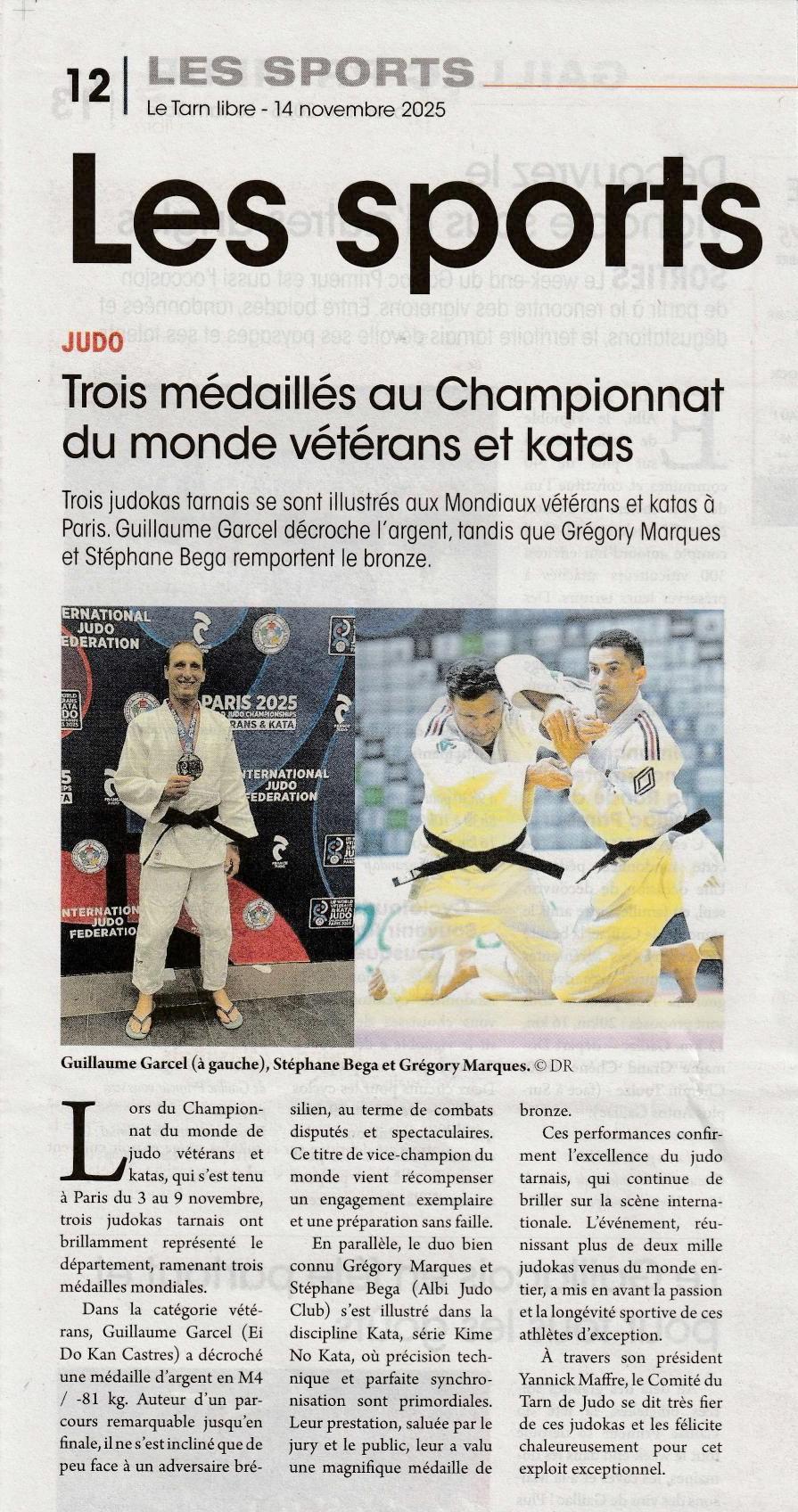 - Article Le Tarn libre du 24/10/25 présentant les judokas Tarnais qui seront présents la semaine prochaine au championnat du Monde Vétérans (Adamou) et au championnat du monde Kata (Stéphane et Grégory)