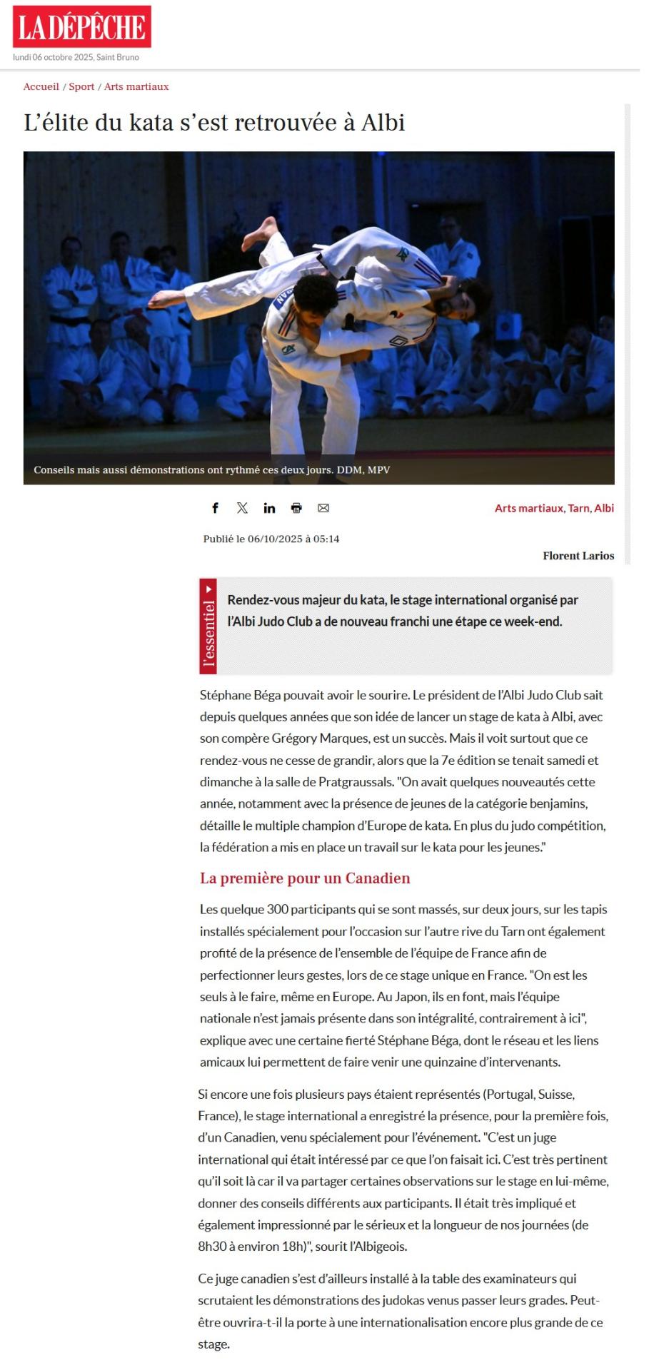L'association Albi Judo Club a organisé les 4 et 5 octobre 2025 la 7ème édition du stage international kata de judo d'Albi à la salle de Pratgraussals transformée le temps d'un week-end en dojo avec environ 800m² de tatamis.